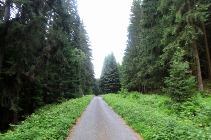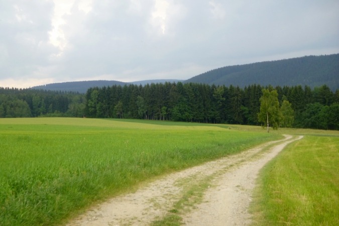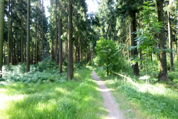 Solltest du doch weiter wollen, trabst du auf Grobschotter auf ein paar Bauernhöfe zu, dann wieder auf die alte Bahntrasse. Die ist heute zur Straße mutiert, nur der aufmerksame Beobachter merkt an kleinen Details, was da mal war. Noch eine Straße und dann in den Wald. Der Himmel bewölkt sich, in der Ferne grummelt es leise. Es bleibt warm, aber erträglich. Am Ende der Bahntrasse, wo mal das Gleis abzweigte, querst du die Hauptstrecke und arbeitest dich in Serpentinen durch die offenen Felder hoch.