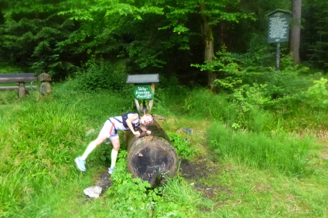 Der Willi-Brunnen ist eine Labsal. Klar und kalt, genau richtig. Kühl dich ab, denn du wirst jetzt heiß laufen auf Schotter, gut planiert und mit zunehmender Steigung. Am Buchenweg wirst du erstmal schimpfen. Der Weg ist völlig zerfahren und verdammt steil. Oben ein sehr kurzes Stück Schotter, dann rechts über eine sumpfige Schonung in den letzten, finalen Anstieg. Was du da siehst, ist ein flaches Stück. Im Wald und dahinter geht es dann richtig rund, nee, hoch. Aber bleib nicht stehen, die Fliegen aus dem Sumpf fressen dich sonst auf. Sie sind groß und laut, lästig und überall: in den Augen, den Ohren, ach überall. Der zarte Fahrtwind irritiert sie ein wenig, also - laufen, so schnell du noch kannst!