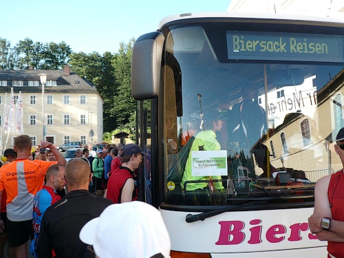 Am nächsten Morgen stehen einige Busse frühzeitig bereit, um die rund 200 Marathonis nach Weißenstadt zu bringen. Abfahrt ist für 07.30 Uhr vorgesehen. Und damit keiner der Halbmarathonis (Abfahrt für sie 30 Minuten später) einen Irrweg einschlagen, fragen die Organisatoren noch mal nach. In rund 20 Minuten Fahrzeit werden wir nach Weißenstadt gebracht.