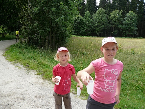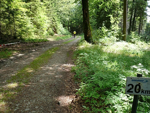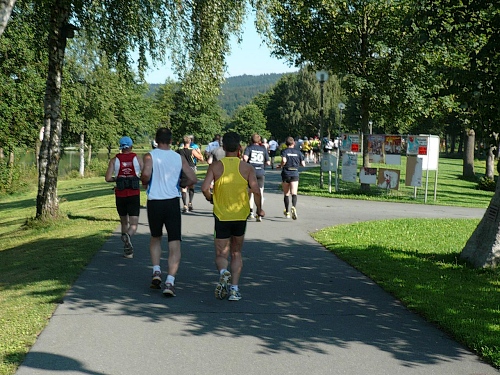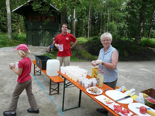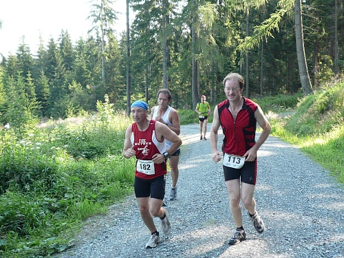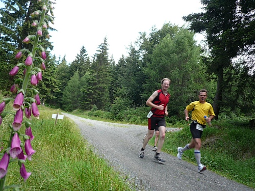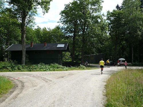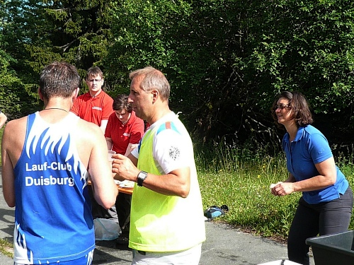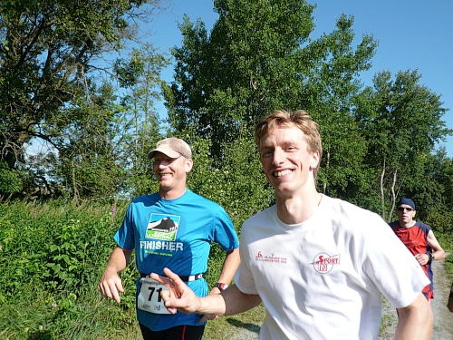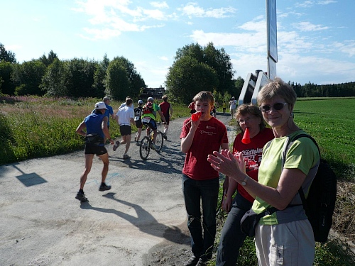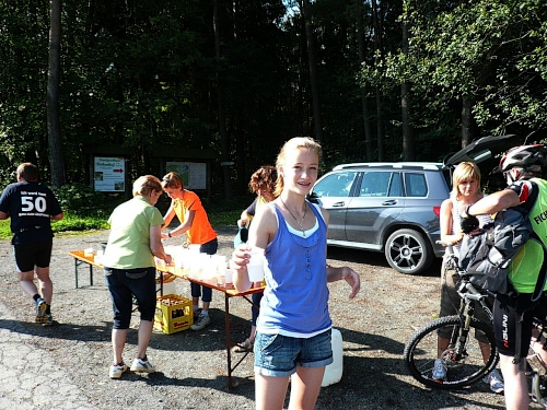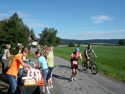 Am Eingang zum Wald (Kilometer 5) finden wir schon die erste V-Stelle. Die ist jetzt anfangs des Rennes schon gut eingerichtet mit Wasser, Iso und Bananen. Später werden wir noch mit Riegel, Cola, Äpfel, Orangen, Schokolade, Brot verwöhnt. Die vielen Helfer, darunter viele eifrige Kinder, lesen uns schon den Wunsch von den Augen ab und reichen zu, bevor wir an den Tischen zum Halten kommen.