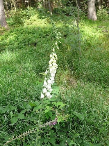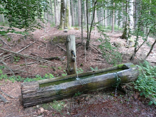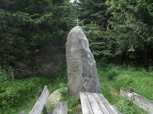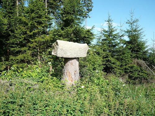 Genau in die Richtung, wo der Hornmusikant hinbläst, geht es abwärts. Das Gefälle beginnt. Zuerst ist der Untergrund noch etwas oberfränkisch rustikal, ein wenig Augenmerk schadet daher nicht. Später biegen wir links ab und die Wegverhältnisse bessern sich. Ein markanter Felsblock markiert die Seehöhe von 1000 Metern, Tausendmeterstein wird der daher genannt.