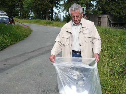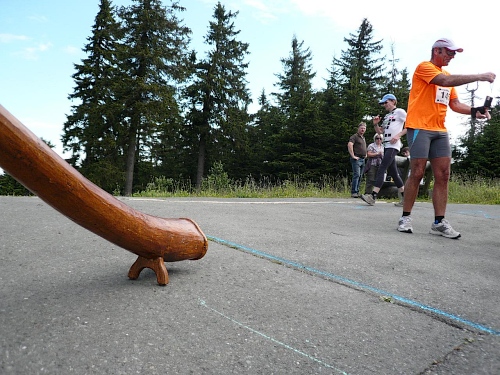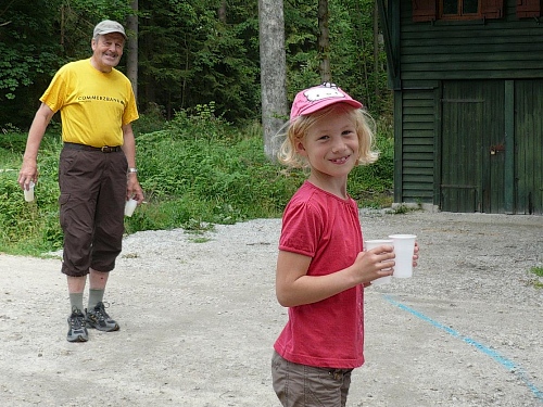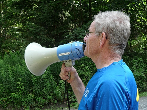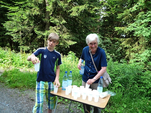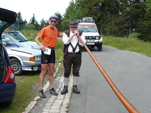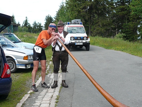 Wo ist denn der Hornbläser, frage ich mich, der uns damals erfreut hat. Ja, das Hirthorn lehnt an einem Auto und der Bläser wurde kurzfristig zum Bechereinsammeln eingespannt. „So geht das nicht“, lasse ich ihn wissen. Er ist ja für etwas anderes engagiert. Der Musikant kommt gelaufen und ich versuche einen Ton aus dem Instrument herauszubringen. Meine dazu notwendige Luft ist jedoch am Anstieg liegengeblieben. Ein Helfer hat das ganze auf meinen Chip gebannt.