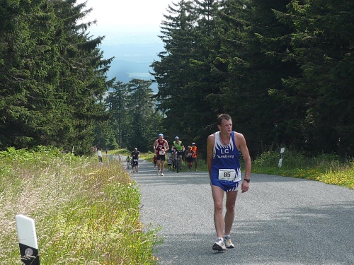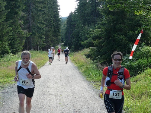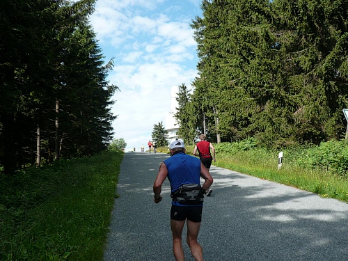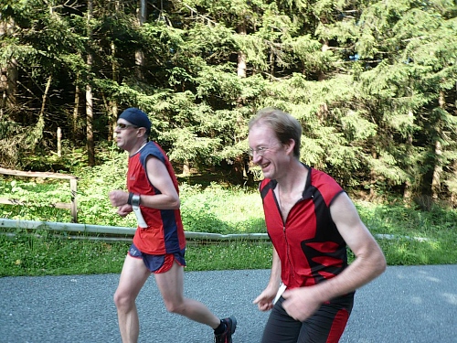 Jens Griesang, den ich eine ganze Weile nicht auf der Marathon(renn)bahn gesehen habe, ist bärenstark. Er hält ohne Probleme mit. Ich kann aber immer bei Fotopausen hinterher springen. Ja, der Jens bezwingt den Schneeberg mit urbayerischer Irxn-Schmoiz. Der hat sogar noch Luft fürs Ratschen, während ich bei mir schon fast Sauerstoffnot feststellen kann.