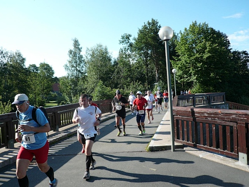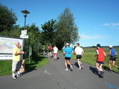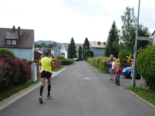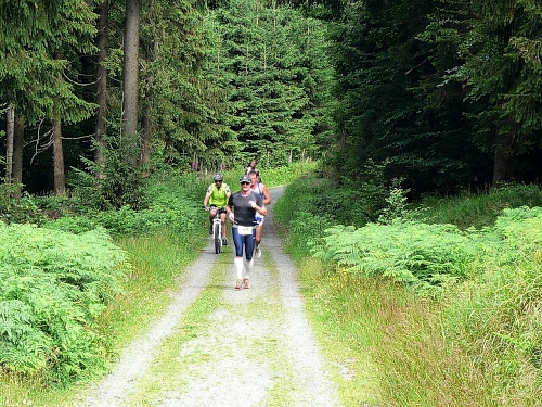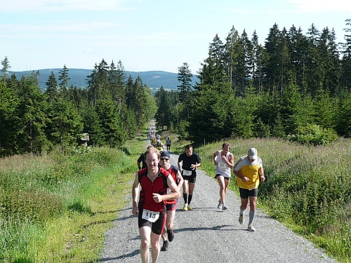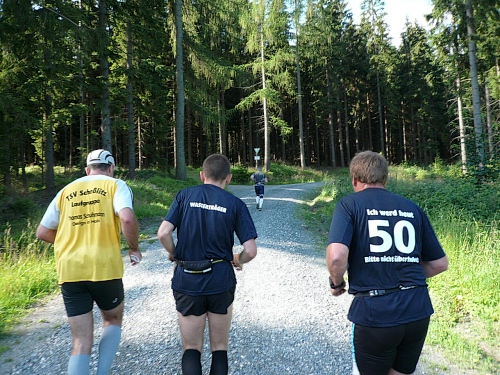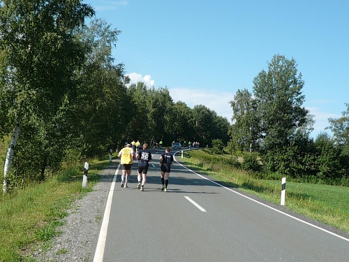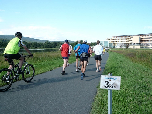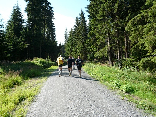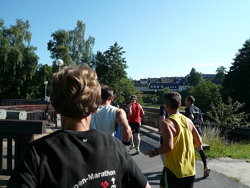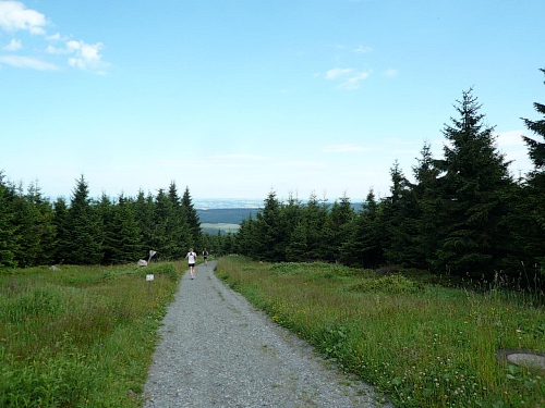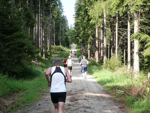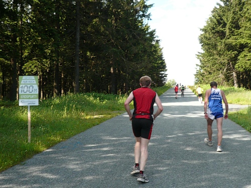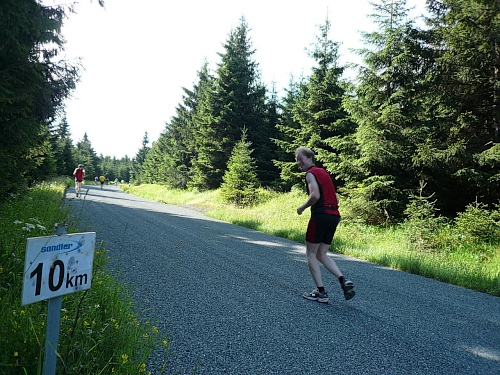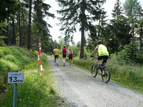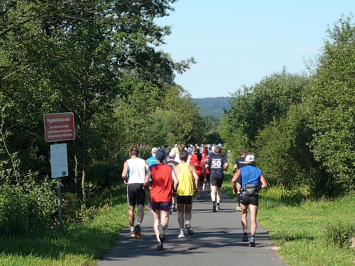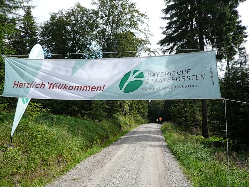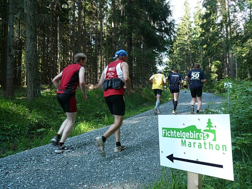 Die Laufstrecke des Fichtelgebirgsmarathons ist meist gut befestigt, nur wenige Kilometer verlaufen auf Asphalt. Für den Läufer sind die Kilometerschilder optimal, denn jeder ist ausgeschildert. Unsere Route ist mit Pfeilen, Schildern und auch rot-weißen Trassierbändern gut markiert. Ein Verlaufen daher schier unmöglich.