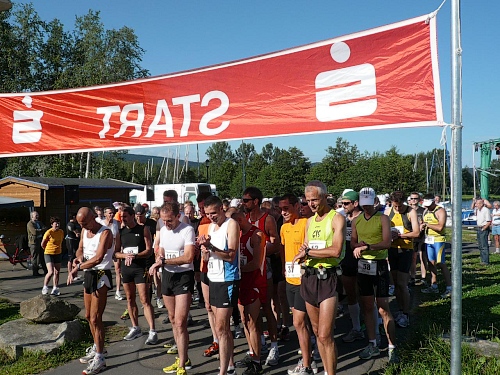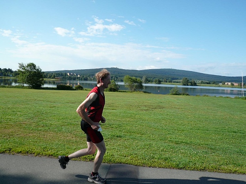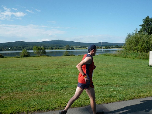 Die flache Runde um den See, gut drei Kilometer, ist gerade recht zum Einrollen, bevor es zum Schneeberg hoch geht. Die Vögel pfeifen, die Temperatur ist noch akzeptabel, der Schatten, wo es denn ein wenig davon gibt, wird ausgenutzt.