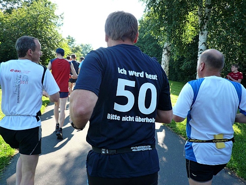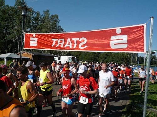 Dann rückt die Startzeit 08.30 Uhr immer näher. Kurz zuvor gibt es letzte Infos von Peter Karl, bevor uns Bürgermeister Frank Dreyer hinausschießt. Über 200 Marathonis machen sich auf ihren Weg.