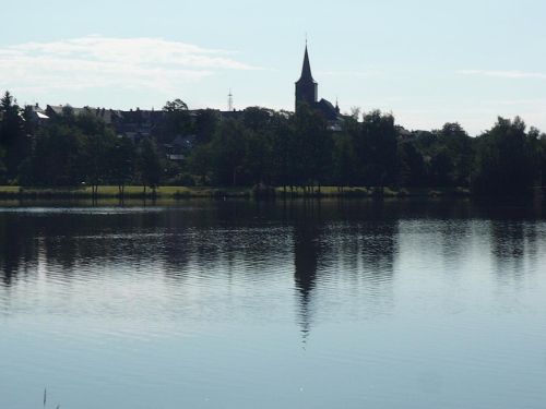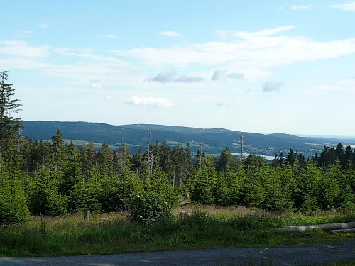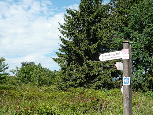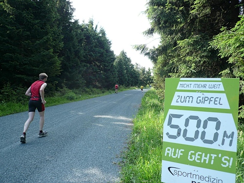 An einer Linkskurve finden wir die nächste V-Stelle. Gut gewählt, denn nun führt uns eine Teerstraße zwei Kilometer hoch zum Schneeberg. Im Schnitt mit rund 10 Prozent Steigung, steiler als zuvor. Ein Wegweiser zeigt zum Schneeberg und zum Backöfele eine Entfernung von 1,8 Kilometern an. Zunehmend verteilt sich das Läuferfeld. Aber da einige noch langsamer die Steigung angehen, bin ich dankbar für das eine oder andere Fotomotiv. Immer wieder haben wir einen freien Blick in das Tal um den Weißenstädter See und sehen, dass wir jetzt schon deutlich an Höhe gewinnen.