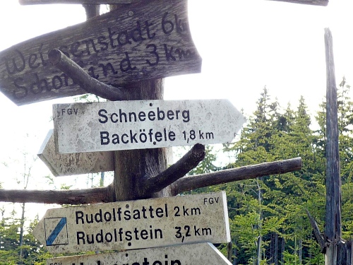 Rund vierhundert Höhenmeter, auf sechs Kilometer verteilt, sind bis zum Gipfel des Schneeberges (1051 Meter über NN) zu bezwingen. Da heißt es Kraft einteilen. Zuerst ist der Anstieg noch passabel, zumal noch einige flache Stücke da enthalten sind. Es ist gut, dass fast der ganze Anstieg im Schatten verläuft. Außerdem ist es aufgrund der Höhe nicht ganz so warm wie in den Tälern.