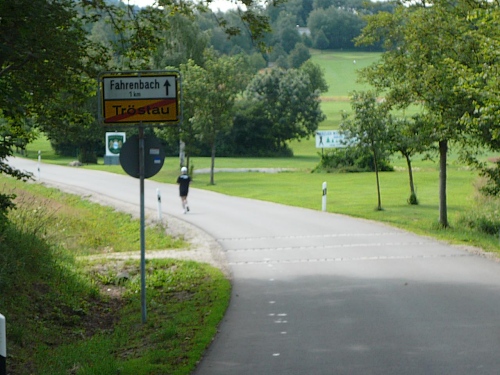 Auf der folgenden Steigung Richtung Golfplatz und Schloss Fahrenbach warten in Summe knapp 200 Höhenmeter. Zuerst laufen wir entlang des Golfplatzes, wo sich bereits Golfer mit ihrem kleinen Ball und den noch kleineren Löchern beschäftigen. Mir geht es nun auf der Steigung gut. Mit Irxn-Schmoiz laufe ich zuerst auf der asphaltierten Straße, später auf dem befestigten Feld- und Waldweg weiter bergauf. Ich sehe Euere Stirn gerunzelt, was für einen urbayerischen Begriff da nun wieder gebraucht wird. „Schmoiz“ kann vielleicht ein Brotaufstrich sein. Aber hier ist Schmoiz nichts anderes als Kraft oder neudeutsch Power. Und Irxn hat nix mit Kraxn oder Krake zu tun, sondern das ist die Achsel. A Irxn-Schmoiz ist also die Kraft, die nicht nur aus den Achseln kommt, a bärig-boarische Power halt.