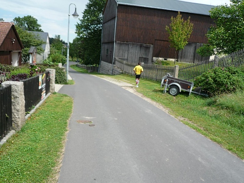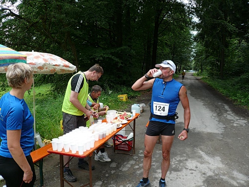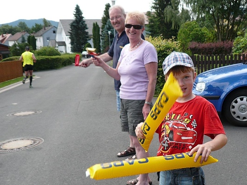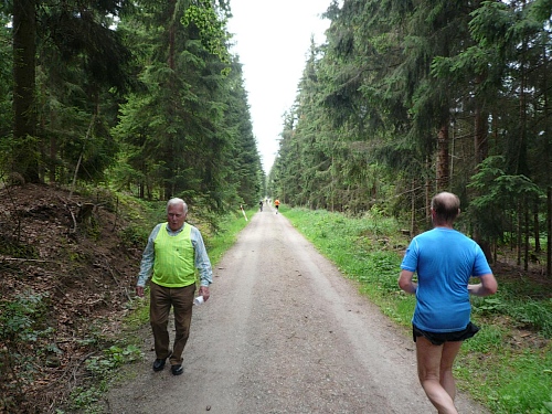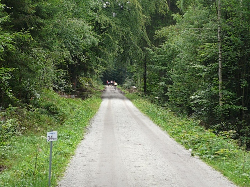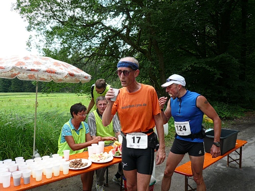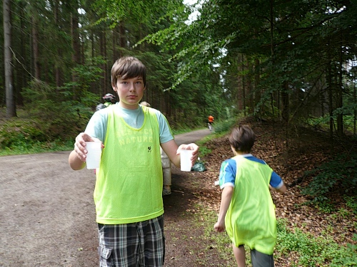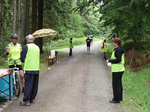 Nicht nur an der V-Stelle bei Kilometer 19, sondern auch an vielen anderen helfen viele Kinder mit dem Verteilen der Getränke. Hier werden wir gleich frühzeitig mit einem Megaphon hingewiesen, was der Speiseplan zu bieten hat. Kurz danach laufen wir unter einem Transparent des Bayerischen Staatsforstes hindurch und werden noch von einem Förster fotografiert. Es ist noch nicht lange her, da mussten Laufveranstalter für das Durchlaufen von Wäldern Benützungsgebühren abdrücken, obwohl die Wege nach den Veranstaltungen meist sauberer waren als vorher. Diese Zeit ist jedoch in den Staatswäldern vorbei. Lediglich in den Wäldern von Privaten und Adeligen muss weiterhin gelöhnt werden.