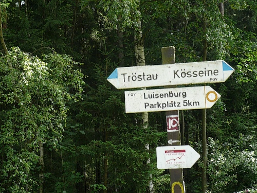 Auf einer ehemaligen Bahntrasse ohne Steigungen laufen wir nach Tröstau hinein. Zuvor geht es bei einer Fußgängerunterführung mit Treppen unter der Bundesstrasse 303 hindurch und wir gelangen in den Ortskern. 1314 wurde die heute 2500-Seelen-Gemeinde erstmals als „Drosen“ genannt. Das Ortsbild prägt der Doppelgipfel der Kösseine.