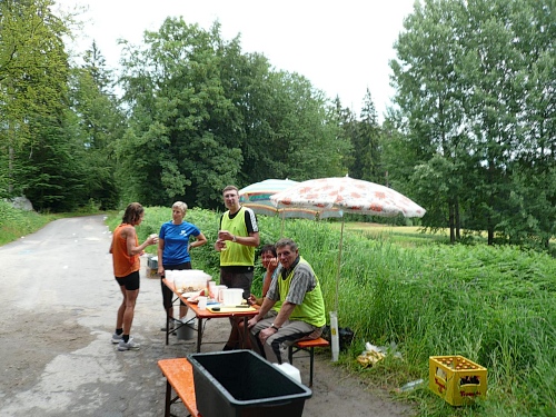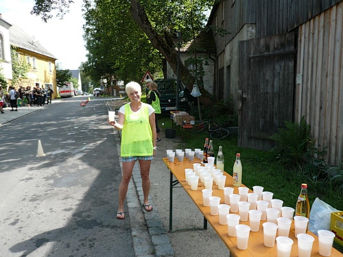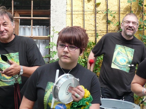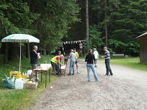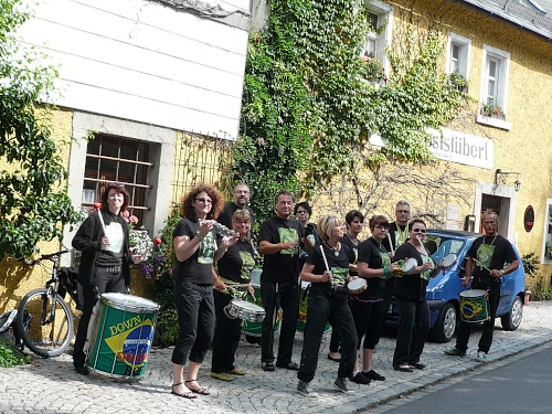 Dann nimmt der Lärm zu. Wie schon auf der Homepage der Veranstalter veröffentlicht, macht die Down Town Samba aus Hof eine prächtige Stimmung für uns und die rund 50 Zuschauer. Rechts finden wir noch eine V-Stelle, wo ich mir Cola reinschütte. Weiter. Die nächste Steigung zur Kösseine wartet.