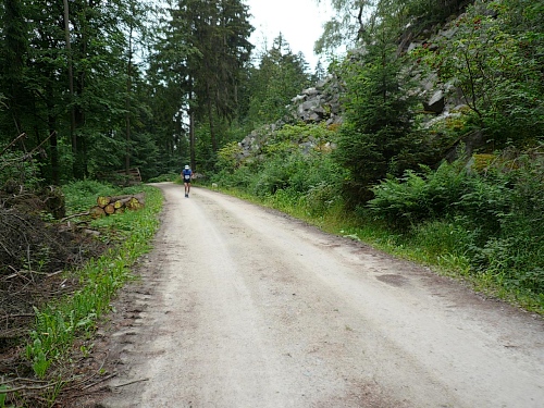 Zur Kösseine gehören Großer und Kleiner Haberstein, Burgsteinfelsen, Mühlstein, Püttners- und Jakobifels. Und an dessen Nordseite befindet sich das Felsenlabyrinth. Zwar sind die Temperaturen etwas gestiegen, aber hier im Wald im Schatten lassen sich die Kilometer gut einsammeln.
