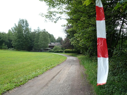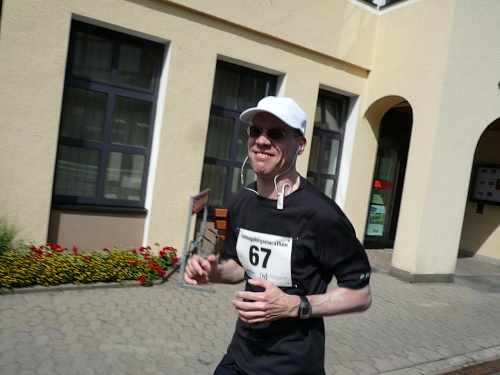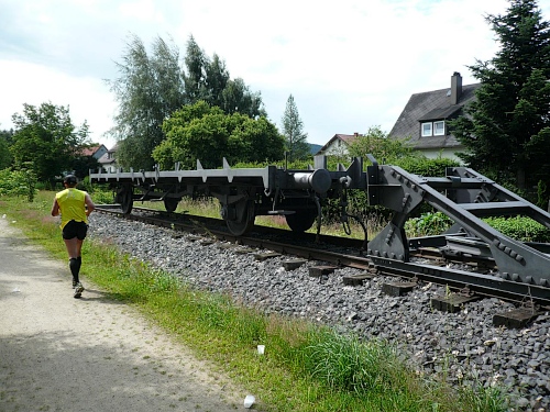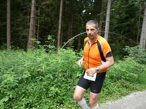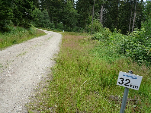 Kurz bevor wir aus dem Wald herauskommen, ist Halbzeit. Ein wenig über zwei Stunden bin ich unterwegs. Für das Unterbieten der vier Zeiteinheiten werde ich mich langmachen müssen. Die Halbmarathonis, die vor 1,5 Stunden losgelassen wurden, sind längst über alle Berge verschwunden. Nichts deutet mehr auf den Start hin, da ist schon alles aufgeräumt und verpackt.