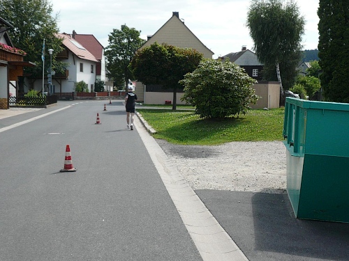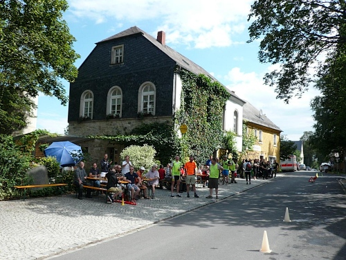 Es geht leicht bergab nach Leupoldsdorf. Zwei Wanderer haben keinen Blick übrig für uns. Kurz nach dem Ortseingang stehen einige Erwachsene mit ihren Kindern und machen mit ihren Ratschen eine gute Stimmung. Das sind wahre Fans. Sehenswert in Leupoldsdorf ist das etwa 700 Jahre alte Hammerherrenschloss. Ein Teil wird davon als Schlossgasthaus benutzt. Das dazugehörende Torbogenhaus wird zurzeit saniert.