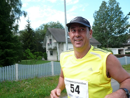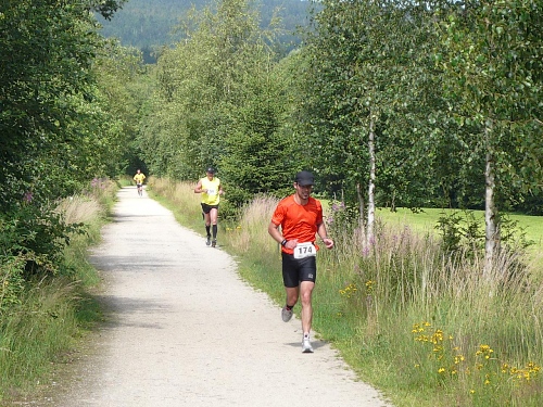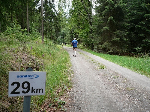 Viele Marathonis gehen, ich kann noch laufen. Kurz nach Kilometer 27 biegt unser Kurs rechts weg, so müssen wir nicht direkt die Kösseine hinauf, sondern umlaufen sie rechts herum. Die V-Stelle am Ende der Steigung ist taktisch gut postiert, so können wir danach ein höheres Tempo anschlagen.