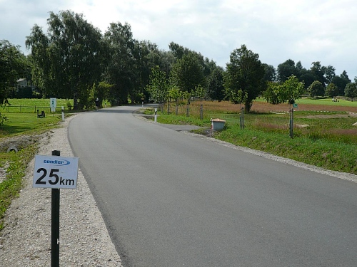 Immer wieder bleibe ich für ein Bild stehen, wo dann die Verfolger wieder näherkommen. Dann werde ich fast übermütig und lasse es nur so rollen. Westlich und südlich des Seehügels (953 Meter) verläuft unser Kurs weiterhin fallend, bis uns etwa 20, 30 zu bezwingende Höhenmeter die Geschwindigkeit nach unten drücken. Ja, da verläuft jetzt die Europäische Wasserscheide. Südlich läuft das Aqua Richtung Naab über die Donau ins Schwarze Meer. Nach Westen wird über Main und Rhein in die Nordsee entwässert.