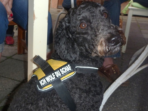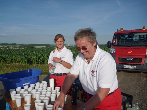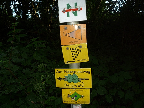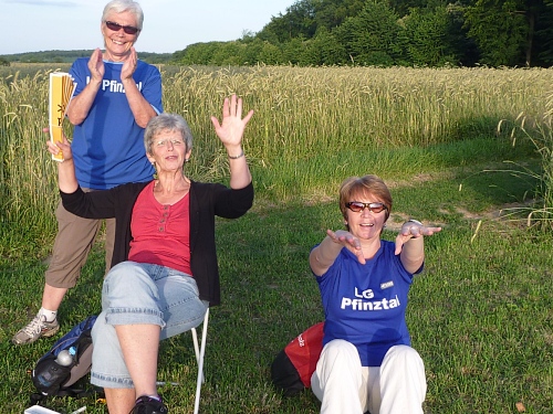 Jöhlingen hat Grundwasser und Annettka verteilt dieses mit einem Gartenschlauch. Früher war sie beim Fidelitas ganz vorne mit dabei. Irgendwann wird sie wieder laufen, so wie früher. Aber heute macht sie mich erstmal richtig nass. Das tut gut, wir haben immer noch 27 Grad und die nächste Steigung steht an. Johannisbeersträucher am Wegesrand. Gerade rechtzeitig kann ich mich bremsen, denn dahinter sitzen die finster dreinblickenden Rentner.