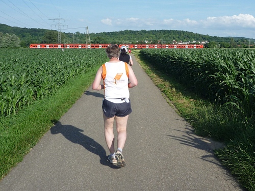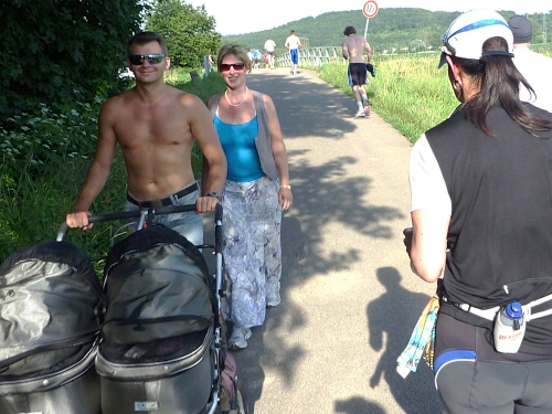 Ein Jungvater mit Zwillingskinderwagen und Frau kommt der Läuferschlange entgegen: „Habt Ihr auch schön Sport gemacht?“ brülle ich. Er, stolz auf seinen gestählten Operkörper, entgegnet schlagfähig: „Ja, gleich geht´s weiter!“