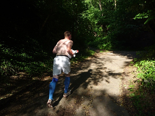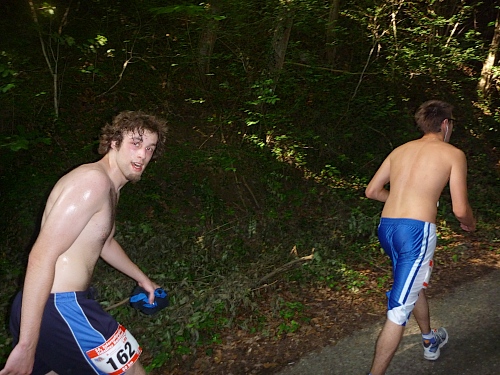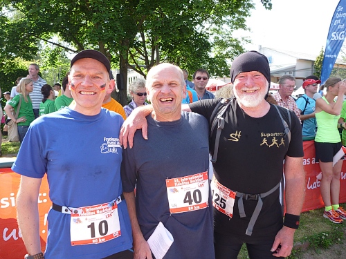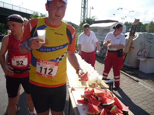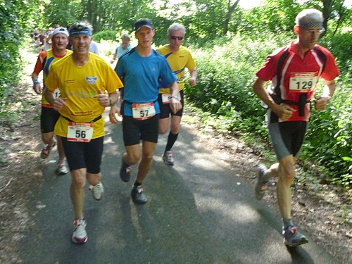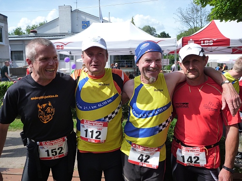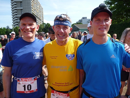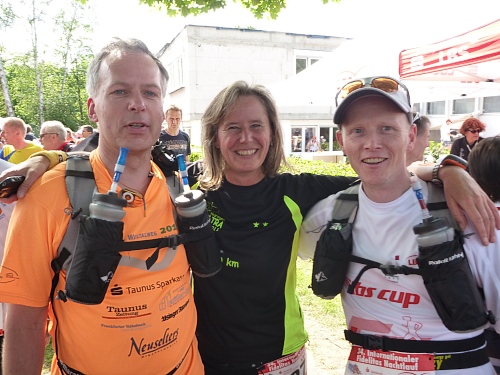 Nach zwei Stunden treffe ich auf Dennis, Stevo und Felix. Mir fallen die drei Jungspunte mit freiem Oberkörper auf, weil sie total unbelastet rumhüpfen. Die Drei laufen ihren ersten Ultra. „Wieviel Marathons seid Ihr denn schon gelaufen?“ „Einen!“ lautet die Antwort. Ein bißchen erzieherisch ist es schon, als ich den Newcomern die kommenden Qualen der Nacht aufzähle. Hätte aber nie geglaubt, dass auch nur einer von denen ankommen würde. Nach dem Blick in die Finisherliste empfinde ich ein wenig väterlichen Stolz, dass ich solche Recken kenne.