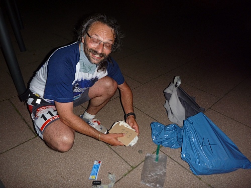 Es ist dunkel, sehr dunkel. Fritz erscheint in meinem Lichtkegel, sieht fertig aus, ist aber der geborenen Kämpfer. Um den muss man sich keine Gedanken machen. Plötzlich liege ich langgestreckt auf dem Boden, wünsche mir in meiner Müdigkeit eine schlimme Verletzung, um nicht mehr aufstehen zu müssen. In Ittersbach, etwa um 1 Uhr nachts machen mich zwei Mädels auf meine blutigen Socken aufmerksam.