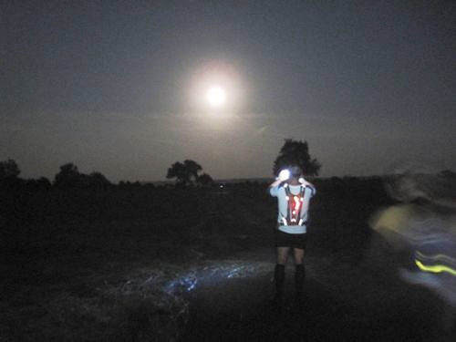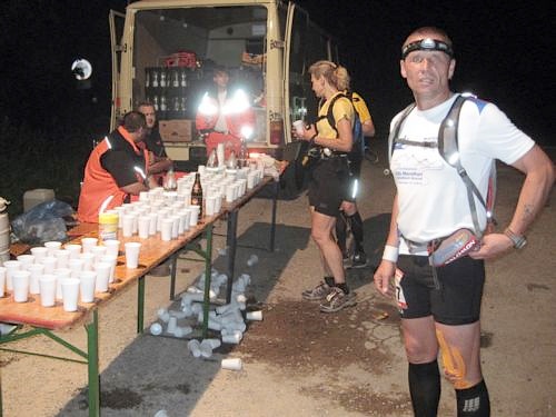 Beinahe zwei Kilometer lief man durch den Ort bis zur Verpflegungsstelle (km 45). Danach aber ging es etwa einen Kilometer lang recht ordentlich hoch und aus dem Ort hinaus, hinein in den Wald. Obwohl wir Vollmond hatten, war es hier so finster, dass man kaum die Hand vor Augen sehen konnte. Hier war die Stirnlampe das erste Mal absolut unverzichtbar.