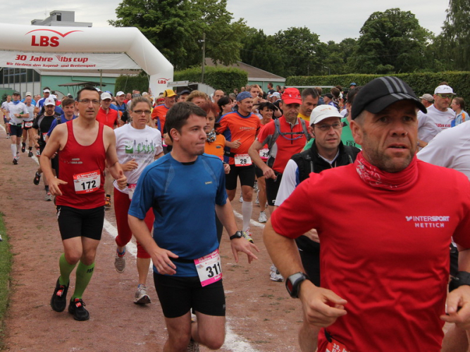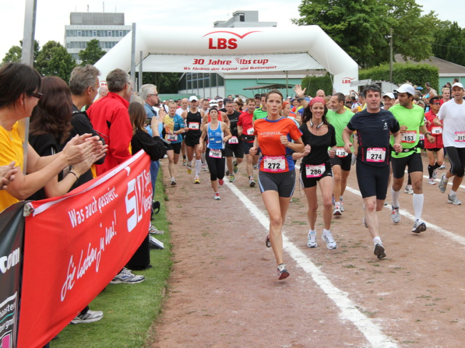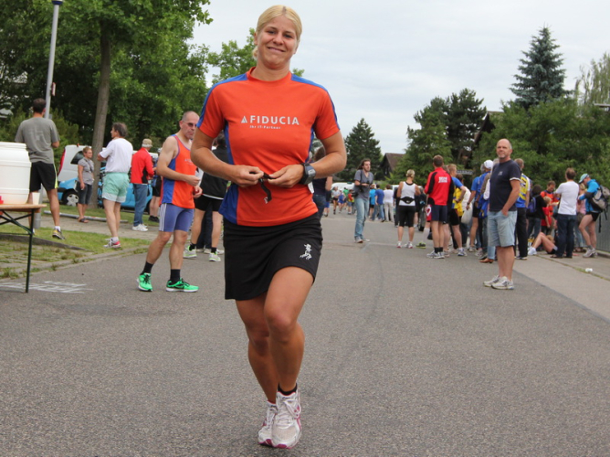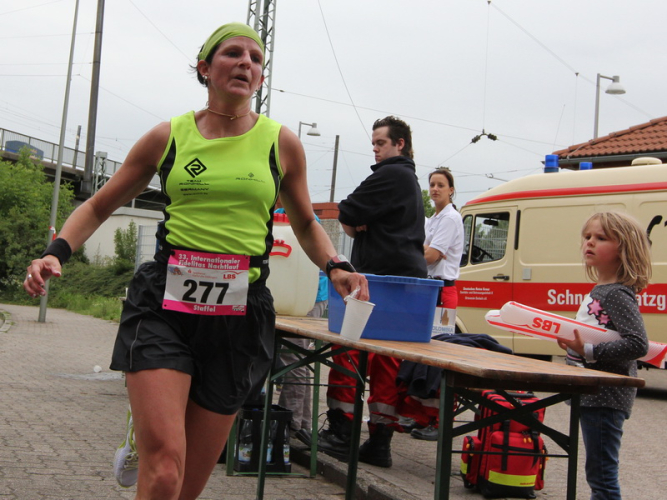 Das ist halt der Vorteil der etwas kleineren Veranstaltungen: kurze Wege und kein Stress. Am Startplatz beim Rathaus ist trotzdem viel Betrieb. Es ist eine Verpflegungsstelle eingerichtet, die Staffelläufer wechseln hier und soeben laufen auch die ersten Ultras durch. Das Häuflein der 80 Marathonis stellt sich respektvoll der Reihe nach entlang der Häuser auf und applaudiert. Gut, dass genau um 20.00 Uhr gerade keiner kommt, der Marathon kann problemlos gestartet werden.