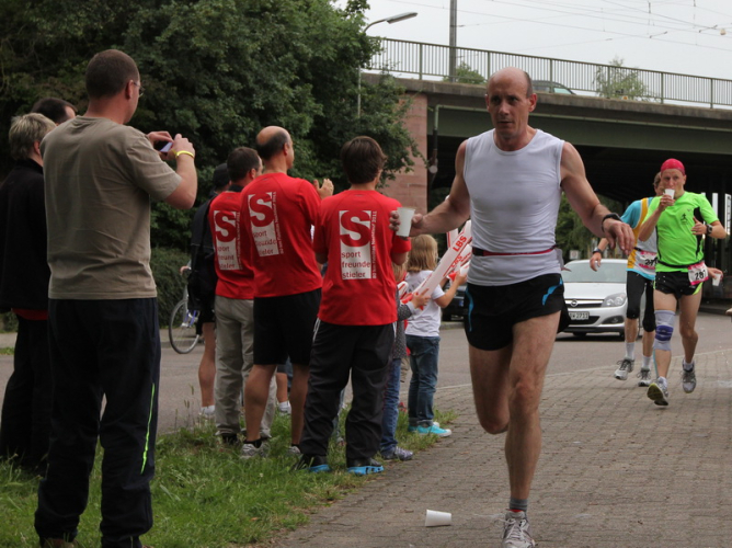 Die Sonne geht unter, schnell wird es dunkel. Ich krame schon mal meine Stirnlampe raus und probiere sie an. Passt und funktioniert. Ist doch gleich was anderes, wenn ich mich so dem Publikum in Ittersbach (km 13) präsentiere. Genau wie Langensteinbach und Mutschelbach ist Ittersbach ein Ortsteil der Gemeinde Karlsbad. Den Nachtlauf lässt man sich nicht entgehen und feiert an der Strecke. Die Leute sind mir sympathisch. Ohne ratlose Blicke oder Rückfragen bekomme ich Antwort, will ich mal wissen, wo ich bin oder ob die Getränke nur für den Eigenbedarf sind. Wir sind halt im Badischen, wenn auch hart an der Grenze.