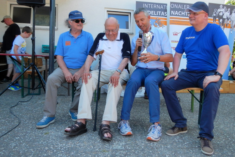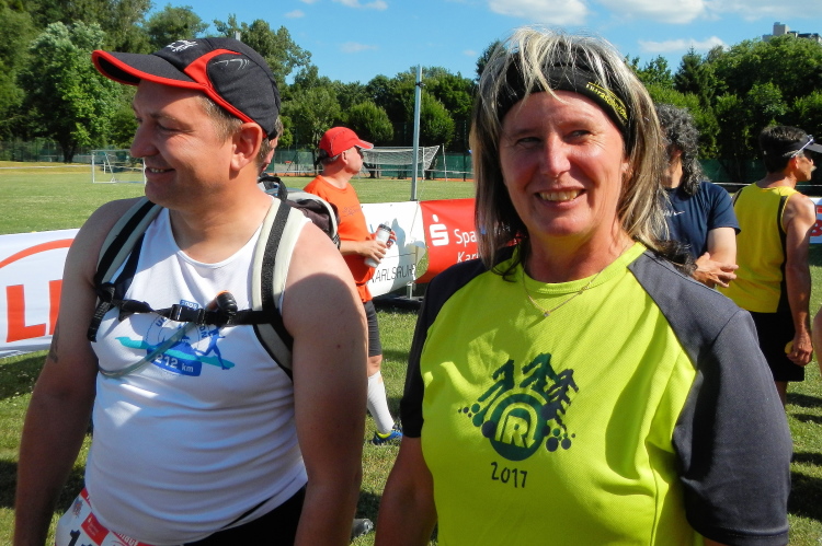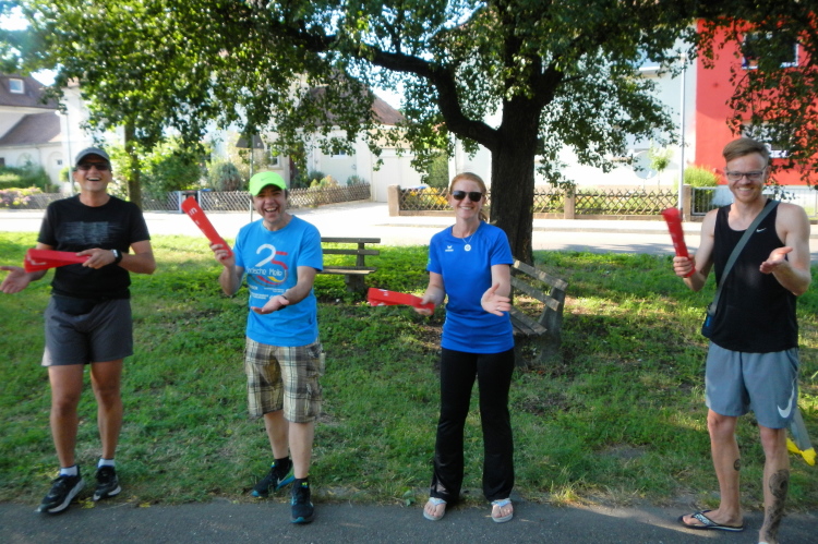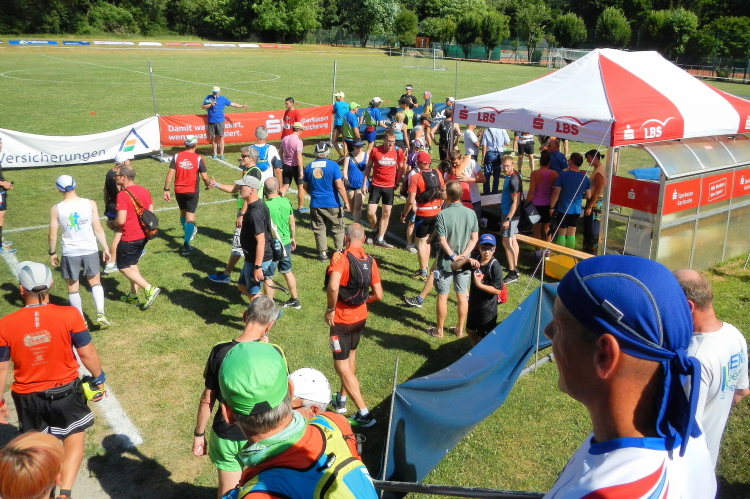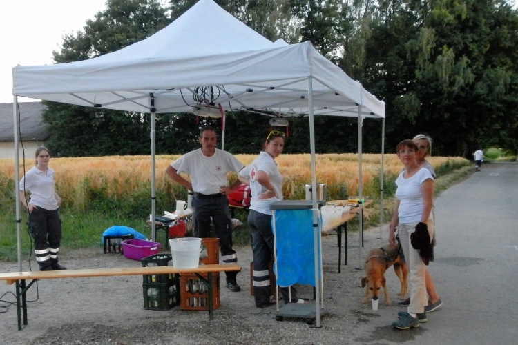 Die Hälfte der Strecke ist fast geschafft. In Mutschelbach sind um 20.00 Uhr die Marathonläufer gestartet und anscheinend haben sie sich zuvor ausgiebig am Verpflegungsposten gütlich getan, der wirkt nämlich etwas zerzaust.