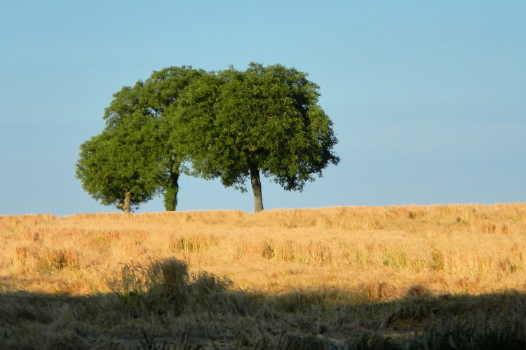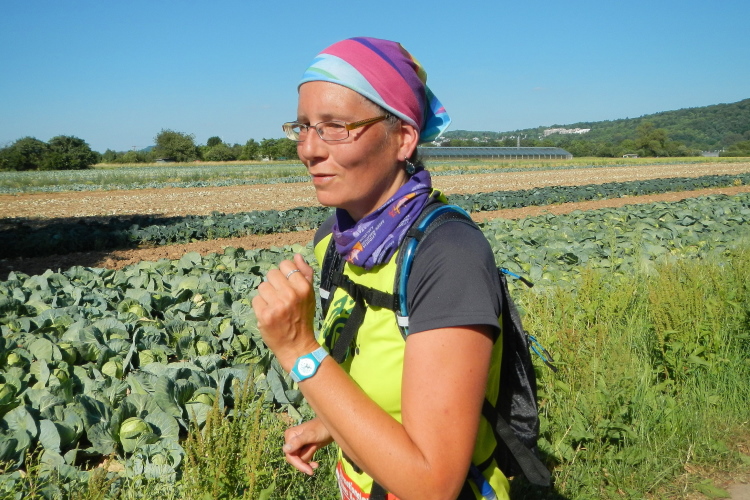 Noch im Wohngebiet kommen sie von hinten mit Blinklicht und Sirene. Nicht irgendwelche Spätstarter, sondern ein Löschzug der Feuerwehr. Sie gehen uns voraus, den Anstieg zum Wald hoch, wo ein Einsatz auf sie wartet. Im dort beginnenden Hohlweg ist Kraxeln angesagt, um an den Fahrzeugen vorbeizukommen. Nach vier schönen Kilometern im Wald geht es hinaus auf eine kleine Hochebene. Die Felder beidseits in der Abendsonne und eine Baumgruppe sind eine Augenweide. Kurz vor Kilometer 25 wird diese Idylle durch einen weiteren Verpflegungsposten verschönert, dann geht es hinunter nach Jöhlingen.