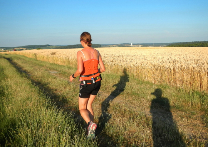 Dreißig Kilometer liegen hinter mir und die Sonne nähert sich schon dem Horizont. Manche brauchen eben länger. Mein langer Schatten begleitet mich entlang der Wiesen und Felder, dann tauche ich wieder in den Wald ein und verlasse ihn erst nachdem vom Feuerball nichts mehr zu sehen ist. Dafür ist bald wieder ein VP in Sicht.