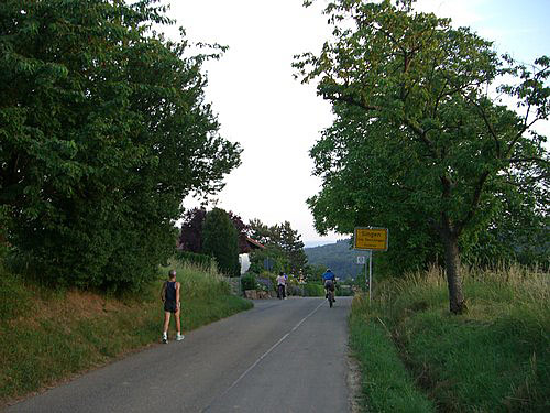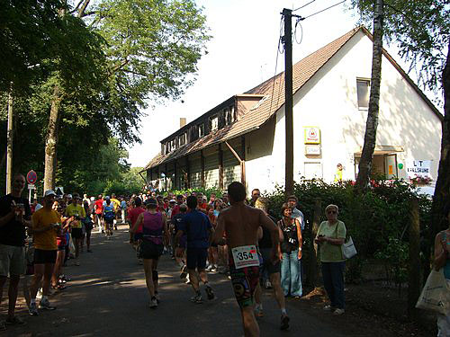 Jetzt geht es weiter über Felder und durch Wälder, mal bergauf, mal bergab, vorbei an Wöschbach in Richtung Singen. Sobald der Weg ansteigt, höre ich auf zu laufen und gehe; bei ebenen oder abfälligen Strecken laufe ich. So fresse ich Kilometer um Kilometer und vertreibe mir die Zeit, indem ich mit anderen Läufern quatsche, die Natur anschaue und mich über die vielen Fußballbegeisterten freue, die am Straßenrand stehen und uns zum x-ten Mal zurufen, dass Deutschland 2:0 gewonnen hat und ins Viertelfinale kommt.