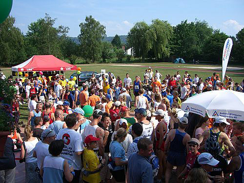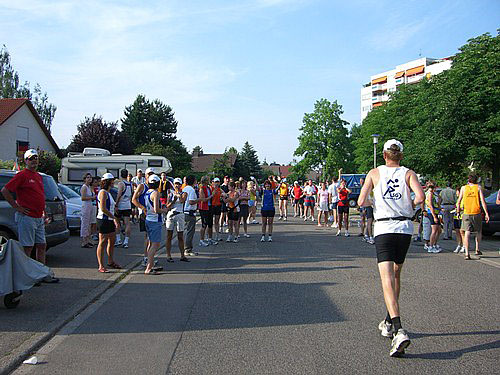 Auf dem Vereinsgelände des TUS Rüppurr sehe ich viele bekannte Gesichter. Auch Bernhard ist hier, der schon viele Ultras gelaufen ist. Er hat mich nach meiner Anmeldung zum Einzellauf bestätigt, indem er mir versicherte, dass ein Marathonläufer auch 80 km schafft und ein 80-km-Läufer auch die 100 km von Biel laufen kann, wenn er sich das Rennen nur richtig einteilt und mit seinen Ressourcen sorgfältig haushält.