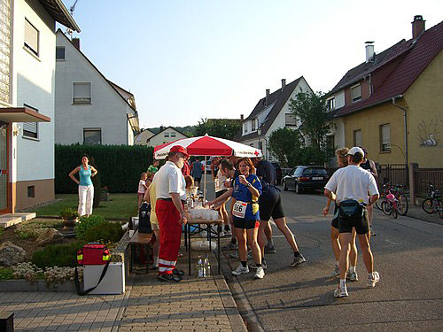 Die Pause hat gut getan. Aber ich brauche eine Weile, um wieder in Gang zu kommen. Erst gehe ich ganz langsam durch Mutschelbach, dann fange ich ganz vorsichtig an zu traben und rechne mir schon aus, wie viele Stunden es wohl dauern wird, wenn ich die jetzt noch restlichen 40 km in diesem Tempo weiterkrieche. In diesem Moment überholen mich Günter und Heidi vom Lauftreff Südwest und muntern mich auf, mich ihnen anzuschließen. Also beginne ich zu joggen und kann plötzlich wieder laufen, als wären die letzten 40 km gar nicht existent. Wir laufen relativ flott aus Mutschelbach heraus in Richtung Karlsbad und schaffen die nächsten 5 km trotz einiger Gehpausen in nur 35 Minuten. Inzwischen ist es dunkel geworden. Auf einem kurzen Waldstück vor Karlsbad überlegen wir schon, unsere Taschenlampen in Betrieb zu nehmen, lassen das dann aber doch sein, weil es hier viele Glühwürmchen gibt, die uns den Weg weisen.