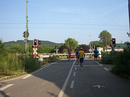 Nach 1:26 Stunden sind die ersten 15 km geschafft. Von hier aus kann man schon Grötzingen mit der ersten Etappen-Wechselstelle erkennen. Doch bevor wir in den Schatten der Häuser eintauchen dürfen, müssen wir nochmal links abbiegen und weitere Kilometer schinden. Der Weg geht wieder nach rechts und – alle Mann stopp! Die Bahnschranken sind unten und wir müssen ein paar Minuten stehen bleiben. So ein Mist. Aber der Veranstalter hat solche Dinge angekündigt und schon vor dem Lauf mitgeteilt, dass die Läufer auf der ganzen Strecke die Straßenverkehrsordnung zu beachten haben. Nachdem der Zug vorbei ist, laufen wir noch etwa zwei km durch die Felder und erreichen nach einer Stunde und 49 Minuten das Ende der ersten Etappe.