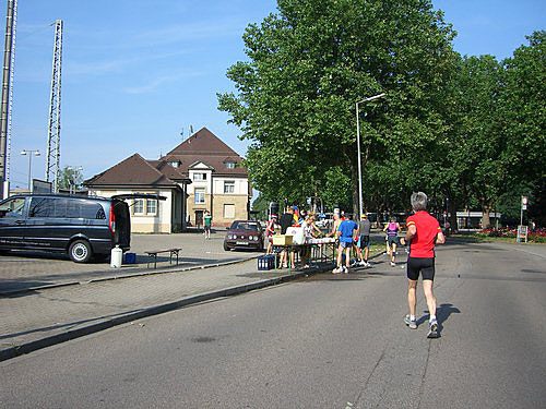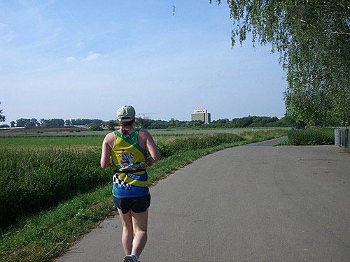 Zufrieden trabe ich weiter und erschrecke fast ein wenig, als ich nach 26 Minuten bereits das 5-km-Schild erreiche. Schnell drossle ich ein wenig das Tempo, was auch Dieter Recht ist, der bereits kritisch seinen Puls beobachtet. Kurz darauf verlassen wir den schützenden Wald und laufen weiter Richtung Industriegebiet Durlach. Dort gibt es für mich die zweite Überraschung. Nach etwa acht km Wegstrecke überhole ich Enrico von unserem Verein, der ja nur die ersten 18,3 km der Strecke laufen muss und eigentlich schneller sein sollte als ich. Aber ich bin auch recht flott unterwegs. Bereits nach 55 Minuten komme ich an der 10-km-Marke vorbei. Doch so lange ich mich wohl fühle, möchte ich eigentlich das Tempo beibehalten, um möglichst schnell aus der quälenden Sonne herauszukommen.