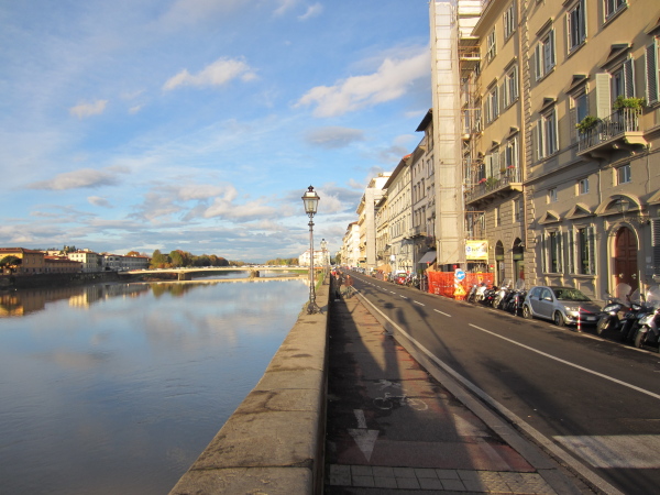 Es wird ein schöner Tag – „è una bella giornata“, sagt der Portier, der mir gut gelaunt auf der Straße vor dem Hotel zunickt und dabei unter der Handfläche seine Zigarette versteckt hält. Ich ziehe trotzdem die Winter-Tight an und werde heute das erste Langarmshirt unseres Clubs tragen, das ich am Tag vor meiner Abreise nach Florenz zugeschickt bekam. Man bietet mir an, nach dem Lauf im Hotel in einem Gemeinschaftszimmer zu duschen, bei 141 Euro pro Nacht inkl. Frühstück für ein EZ ist dieses Entgegenkommen fast normal.