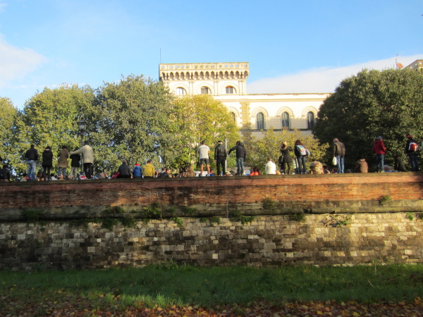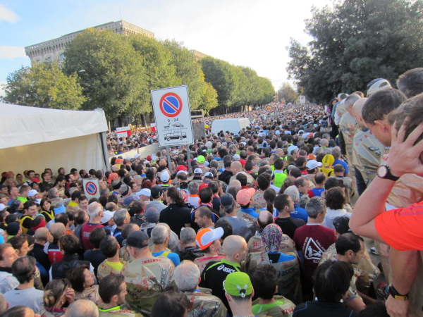 Der Platzsprecher jubelt über mehr als Zehntausend registrierte und damit potenzielle Teilnehmer aus über 60 Ländern, über 100 kommen aus Österreich – das erwähnt nicht er, sondern es ließ sich abfragen. Ich steige auf eine Schutzmauer wie einige andere Läufer vor mir und balanciere gut 5 Meter über das gemauerte Flussbett in gefährlicher Manier, knipse dabei von oben die Warteschlange – ein interessanter Ausblick. Schließlich springe ich von der Mauer aus geringer Höhe auf einen Betonsteg und gehe an vielen anderen Läufern vorbei, die gerade beim Düngen der Botanik nahe dem Arno sind – es riecht nach NH3, um es chemisch auszudrücken. Bei der Menge muss man auch auf den Boden achten, damit man keinen Abdruck mitnimmt.