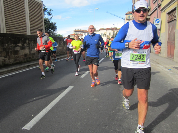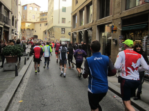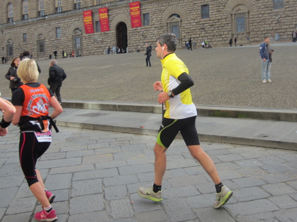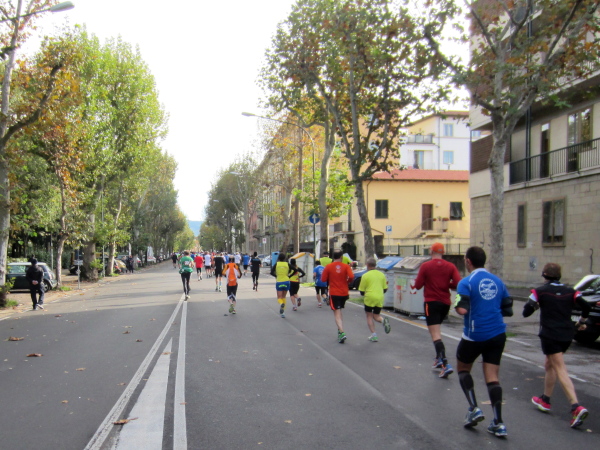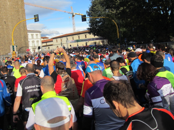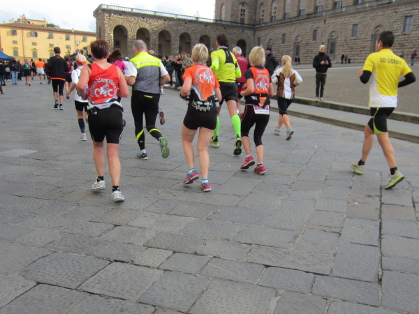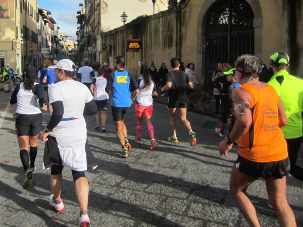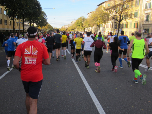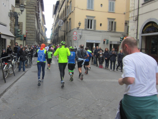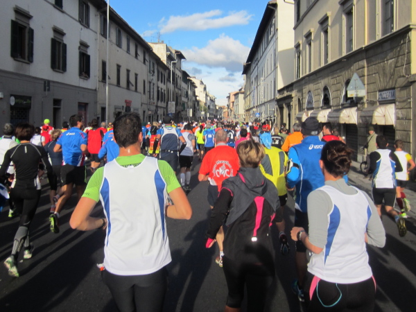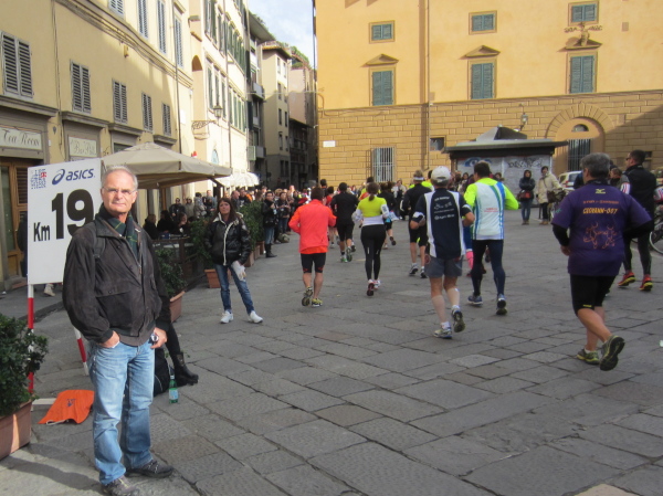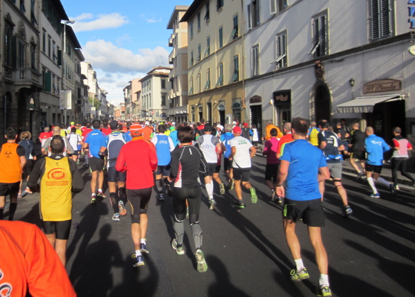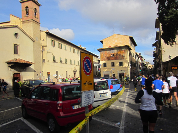 Auf den ersten fünf Kilometern gibt es viel Kommunikation auf Small-Talk-Niveau, denn je enger die Straßen sind, desto mehr Gedränge entsteht und je eher kommt man ins Gespräch. Was mir auffällt, ist das scheinbar geringe Zuschauerinteresse außerhalb der città, nur vereinzelt stehen Menschen am Gehsteig und schauen den Läufern zu bzw. nach. Was habe ich heuer in anderen Städten schon für schöne Fotos geschossen, von Müttern mit Kleinkindern am Arm oder im Huckepack, von Kindern mit Schnuller im Mund oder Eistüte in der Hand, von der älteren Damen mit einem weißen Puddel, der mich ankläffte, als ich statt Frauchen ihn knipste. Doch die Begeisterung am Start war groß, sobald wir in das Zentrum von Florenz zurückkommen werden, werden auch die Zuschauer an der Strecke wieder die Läufer anfeuern.