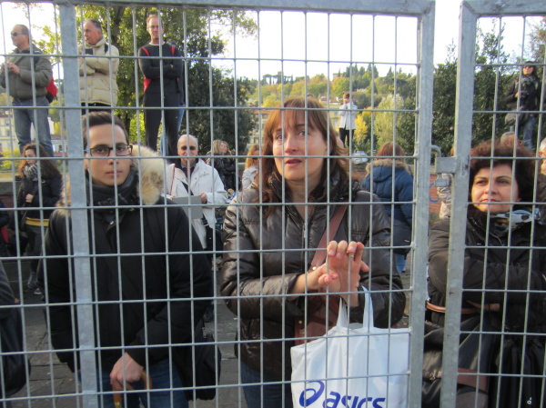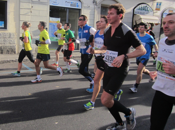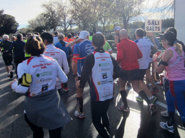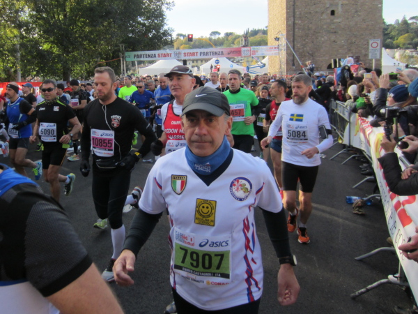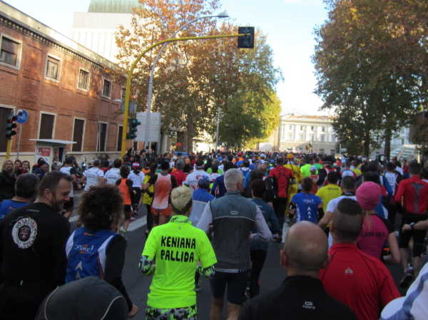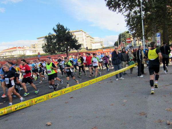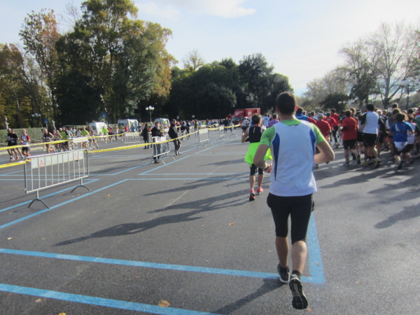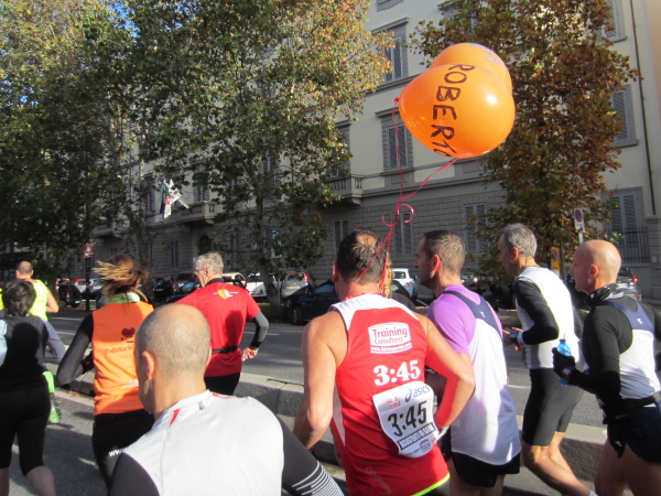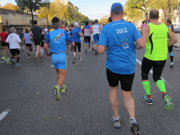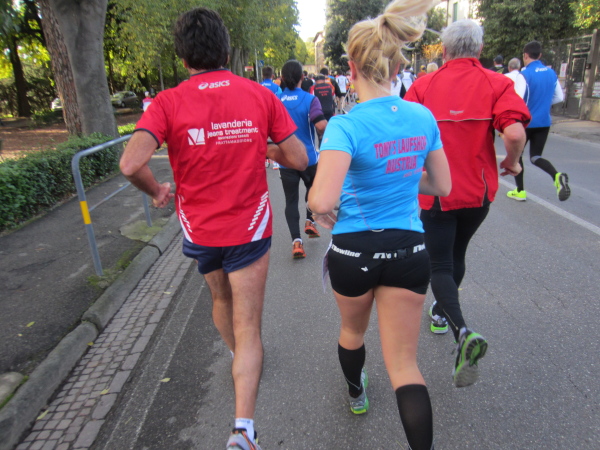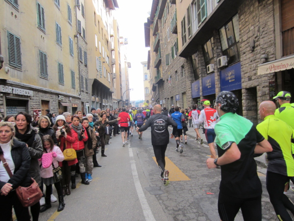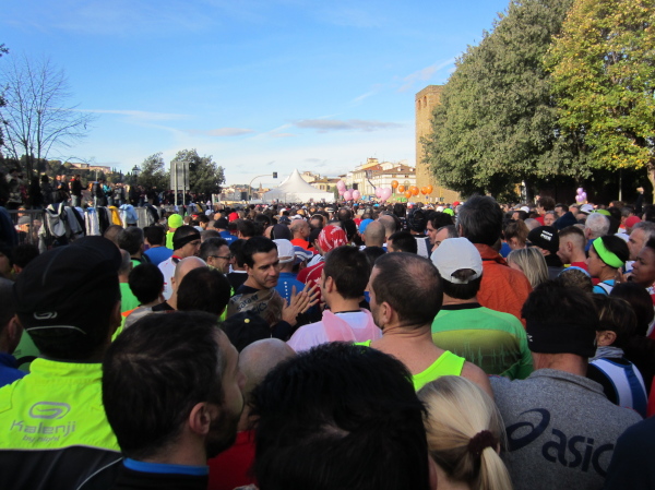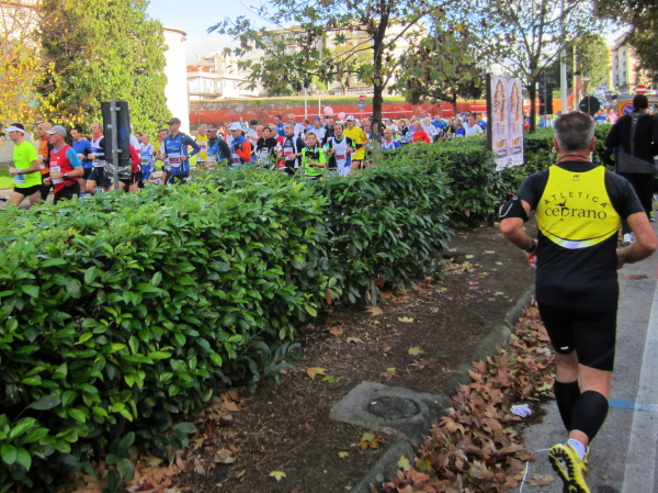 Auf den ersten fünf Kilometern gibt es viel Kommunikation auf Small-Talk-Niveau, denn je enger die Straßen sind, desto mehr Gedränge entsteht und je eher kommt man ins Gespräch. Was mir auffällt, ist das scheinbar geringe Zuschauerinteresse außerhalb der città, nur vereinzelt stehen Menschen am Gehsteig und schauen den Läufern zu bzw. nach. Was habe ich heuer in anderen Städten schon für schöne Fotos geschossen, von Müttern mit Kleinkindern am Arm oder im Huckepack, von Kindern mit Schnuller im Mund oder Eistüte in der Hand, von der älteren Damen mit einem weißen Puddel, der mich ankläffte, als ich statt Frauchen ihn knipste. Doch die Begeisterung am Start war groß, sobald wir in das Zentrum von Florenz zurückkommen werden, werden auch die Zuschauer an der Strecke wieder die Läufer anfeuern.