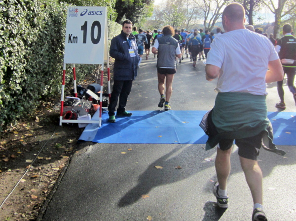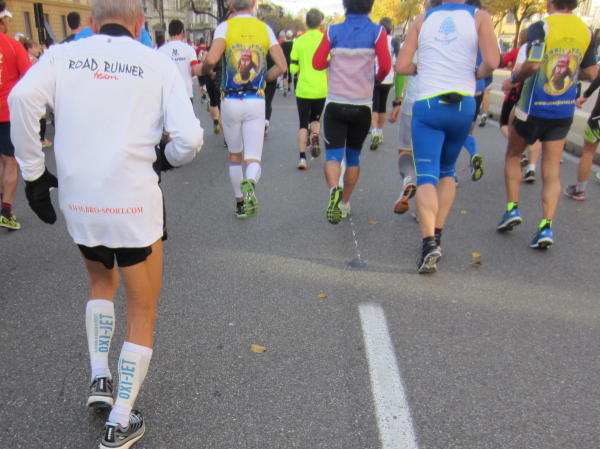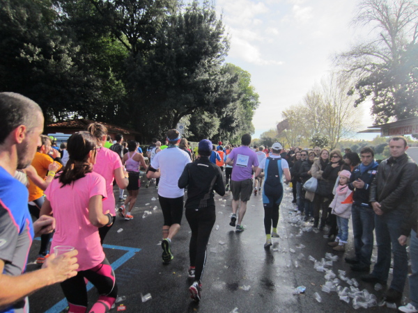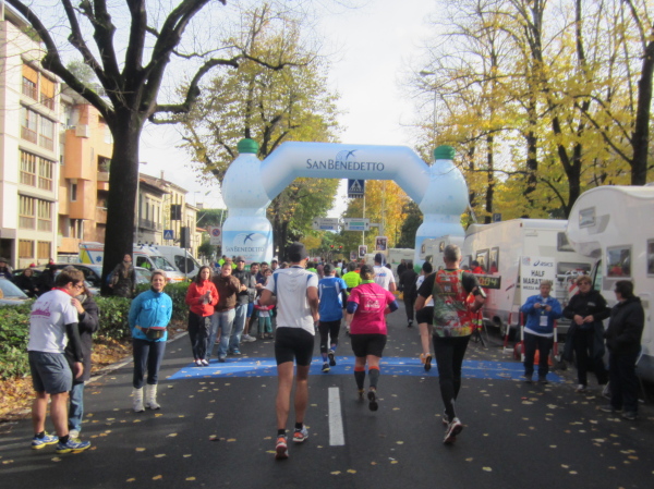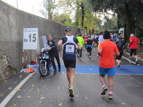 Wir laufen an dem Ponte Vecchio vorbei, die wir erst bei Kilometer 39 überqueren werden. Jetzt geht es weiter an der südlichen Arnoseite entlang dem Lungarno Torrigiani und L. Serristori über den Ponte San Niccolo auf die andere Flußseite, wo die Halbmarathondistanz auf dem Lungarno del Tiempio erreicht wird. Die offizielle Zeitnehmung zeigt beim Durchlaufen 2:10:08, ein paar Minuten muss ich abziehen, mit 2:06:46 passt meine Nettolaufzeit bisher. Doch wir haben erst die Hälfte zurückgelegt, nochmals sind 21,1 km zu laufen – einige marschieren jetzt schon. Nach 3 Stunden sollte man die Halbmarathon-Marke erreicht haben, der Kurs ist 6 Stunden geöffnet. Wenn ich an Bratislava, Laibach oder auch Bad Füssing denke, wo man rigoros gegen „Temposünder“ vorgeht – in Italien vergrämt man niemand, auch auf die Allerletzten wird gewartet.