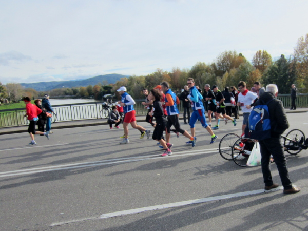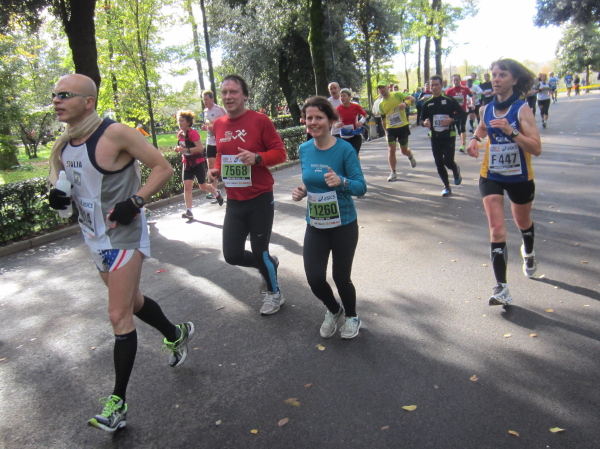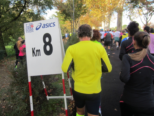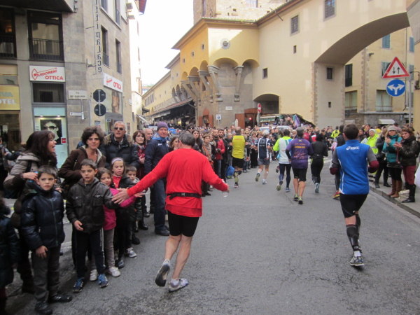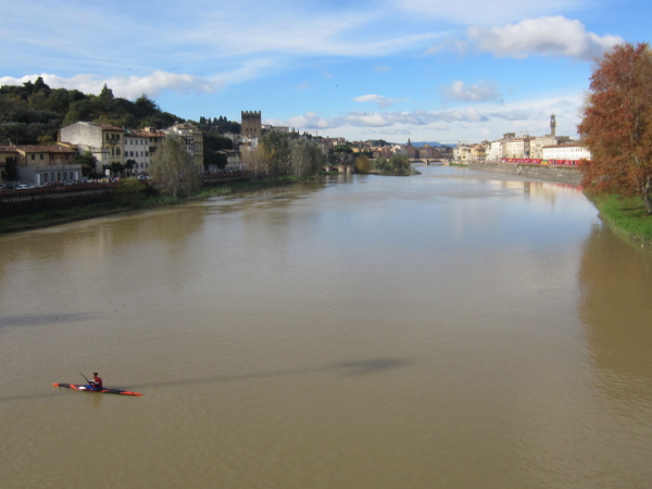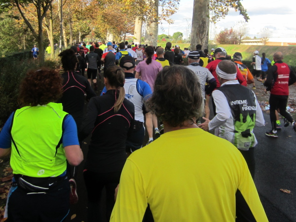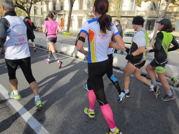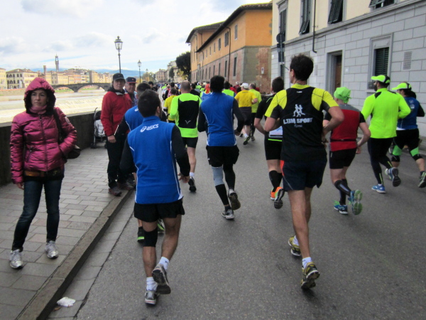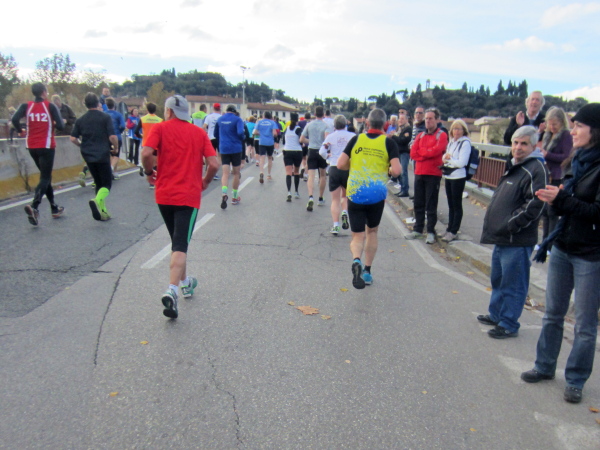 Bald darauf geht es bei der Piazza Vittorio Veneto auf den Ponte della Vitoria, der über den Arno führt. Die Strecke am Fluss, dessen Bett 15 bis 20 Meter tiefer liegt, entlang des Lungarno delle Rose und L. Doderini bietet viele Panoramafotos mit Blickrichtung Stadtzentrum bzw. zum Ponte Vecchio. Immer wieder kommt es zu kleinen Duellen, der eine will den anderen überholen, doch der andere gibt nicht nach. Auch ich habe eine Verfolgerin dicht hinter mir – eine Frau Mitte Fünfzig mit der französischen Fahne als Wangenbemalung. Sie kämpft tapfer, erst als ich kurz stehenbleibe, um zu knipsen, liegt sie vor mir. Mir tun die 15 Sekunden-Pause gut. Wer weiß, ob ich Madame auf den noch offenen 24 km nicht noch antreffen werde.
