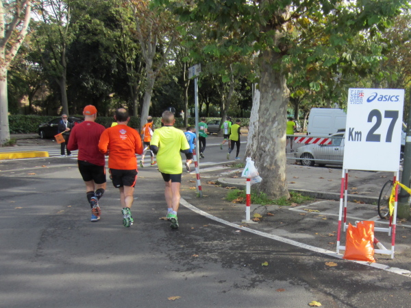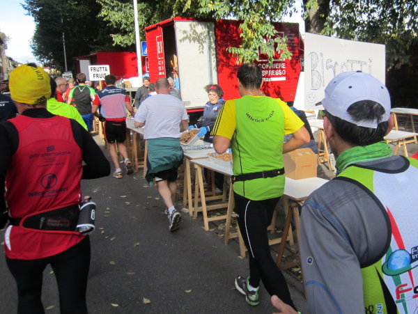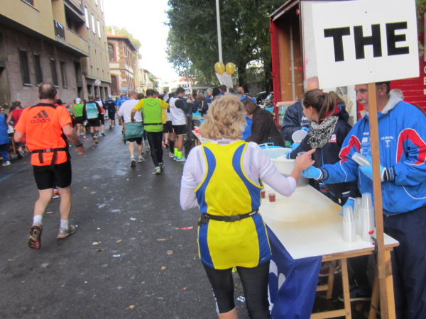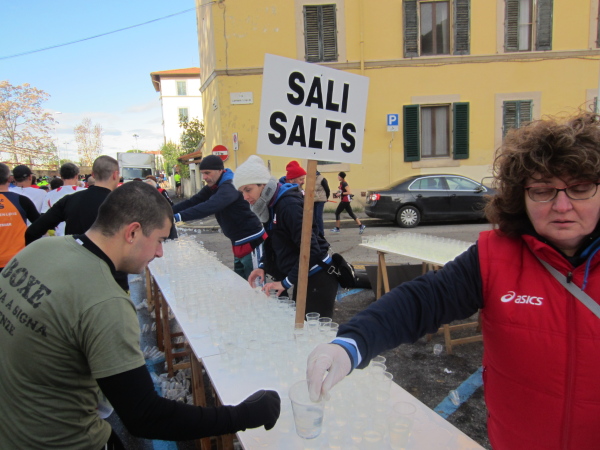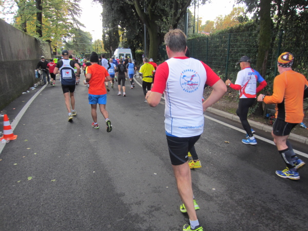 Nach der Halbmarathon-Distanz verläuft die Strecke wieder im spitzen Winkel über die Straßenabschnitte via Aretina, Credi und Manneli nach Nordwesten. Die Gegend um den Bahnhof im Campo Marte von Florenz ist nicht wirklich ein Highlight. Bei der 25 km-Labe spricht mich wieder eine Landsfrau an: „I hob goa nit gwusst, dos es so an Club gibt, hobt’s ihr olle zsamm schon 100 Marathons oder?“ Ich antworte der Kollegin aus einem ländlichen Bundesland: „Von derzeit 26 Mitgliedern haben 13 mehr als 100 erreicht“.