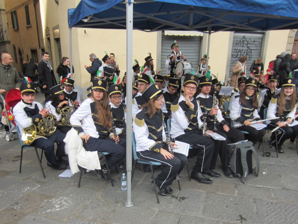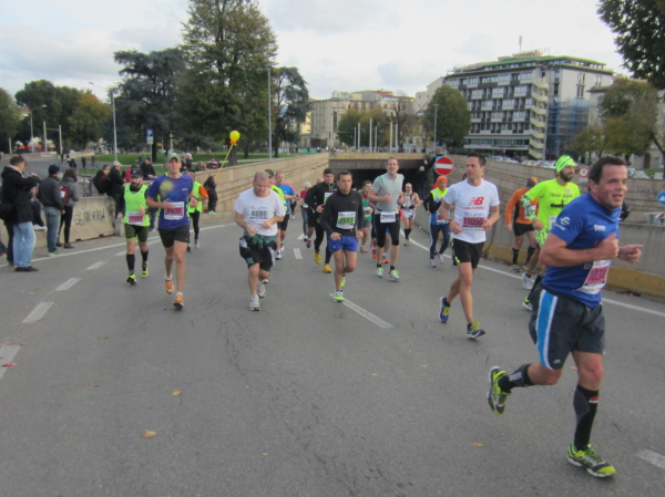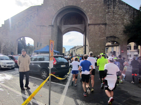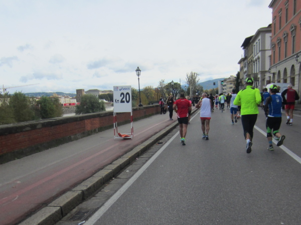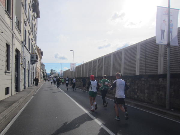 Nach 3 Kilometern kommen wir an der Fortezza da Basso vorbei, einer architekturhistorisch bedeutende Festungsanlage des 16. Jahrhunderts. Knapp vor einer Bahnunterführung werde ich von hinten mit „Hallo Austria“ begrüßt – eine sportliche und hübsche Frau um die 30 läuft mit dem 4 Stunden-Tempomacher einher und dürfte auch aus Österreich kommen. Wenige Minuten später überholt mich beim 50m-Anstieg eine Frau Mitte Vierzig mit den Worten „Bin auch schon 18 Marathons gelaufen“. Ich frage rhetorisch nach „Heuer oder insgesamt?“ Sie wünscht mir einen guten Lauf. Auf ihrem Shirt lese ich „LC Saalfelden“. Ich bleibe kurz stehen und knipse die nachkommenden Läufer, einige keuchen hörbar laut, dass man ihnen empfehlen müsste, den eigenen Sport zu hinterfragen oder zumindest das Leistungsniveau.