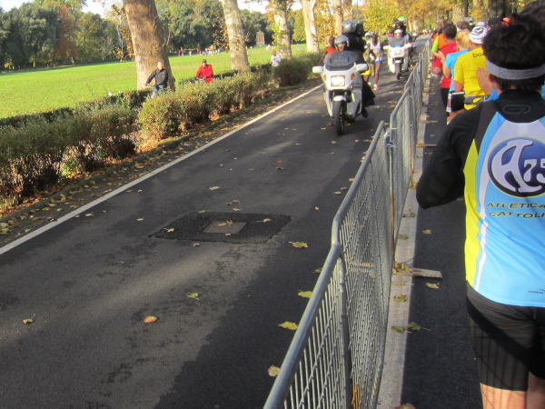 Knapp vor Kilometer 8 kommt auf der durch eine Absperrung getrennten Piazzale dell’Indiano die Spitzengruppe eskortiert von zwei Polizisten auf Motorrädern auf uns zu. Wenig später bin ich wieder Gegenstand der Aufmerksamkeit: Drei Italiener sind dabei, mich zu überholen. Einer der Läufer wundert sich, wie ich heuer, Florenz eingerechnet, schon 50 Marathons gelaufen sein kann, wenn in diesem Jahr erst 47 Wochen vergangen sind. Ich drehe mich zu Ihnen rüber und sage, dass ich einige ausgefallene Wochen im Jänner und zu Ostern mit sieben Doppelpacks kompensiere und im Dezember noch ein paar Läufe dazukommen werden. Und rufe ihnen nach: „Ma sono un lento correre …“