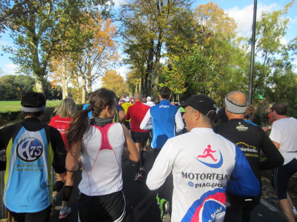 Die zweite Labe ist exakt nach 10 km im Park an der Piazzale Kennedy eingerichtet, wo auch wieder einige Zuschauer das Geschehen verfolgen. Wegen eines kurzen Austrittes ins Gebüsch habe ich fast eine Minute verloren, liege aber noch immer unter 60 Minuten. Ich hoffe, dass ich bis zur 15 km-Marke, die sich ebenfalls noch im Parco delle Cascine befindet, unter 1:30 Stunden bleibe. Der Kurs verläuft nun wieder nach Osten, also zurück in die Nähe des Zentrums von Florenz. Der aufkommende Wind bremst, ich reihe mich hinter einer Gruppe ein, die mein Tempo läuft. Beim Radfahren ist das Windschattenfahren gang und gäbe, beim Laufen ebenso nützlich. Wenn einer ständig Führungsarbeit machen muss, verausgabt er sich. Daher wechseln sich auch die Spitzenläufer beim Marathon ab, zumindest auf den ersten 30 km.