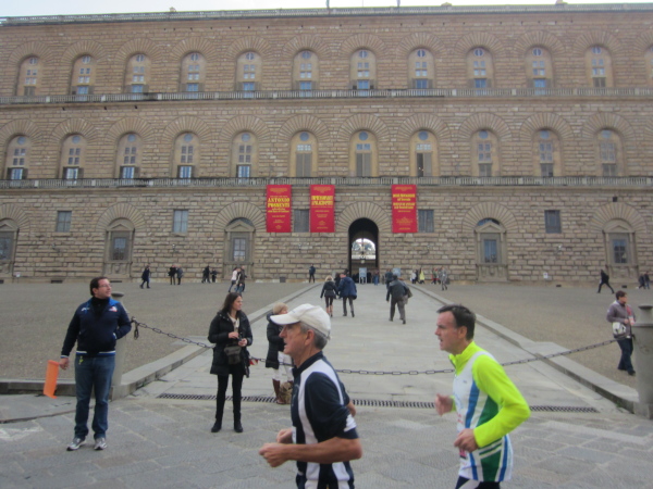 Der Kurs verläuft über die via dei Seragli nun wieder nach Süden, vom Arno weg bis zur Piazza Calcia, von dort in einer 180 Grad Wende zum Fluss in Richtung der Piazza del Pitti, vorbei am bekannten Pallazio Pitti, einem Renaissance-Palast im Stadtteil Oltrarno, der um 1458 für den Kaufmann Luca Pitti erbaut wurde. Das Gebäude war seit dem 16. Jahrhundert Residenz der Herzöge von Toskana, später die Florentiner Residenz des Königs von Italien. König Viktor Emanuel III. trat ihn 1919 an den italienischen Staat ab – seitdem sind der Palazzo Pitti und seine Gemäldesammlungen öffentlich zugänglich, darunter die Galleria Palatina der Medici mit Werken von Tizian, Giorgione, Raffael und Rubens und die Galleria d'arte moderna mit Werken vom Klassizismus bis zum Beginn des italienischen Futurismus an der Jahrhundertwende des Zwanzigsten Jahrhunderts. Wir sind bei Kilometer 19 angelangt, der Blick auf die Uhr bestätigt mein Gefühl für das Lauftempo - ich liege knapp unter der 6er-Zeit.