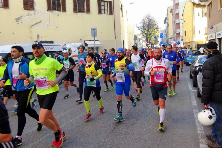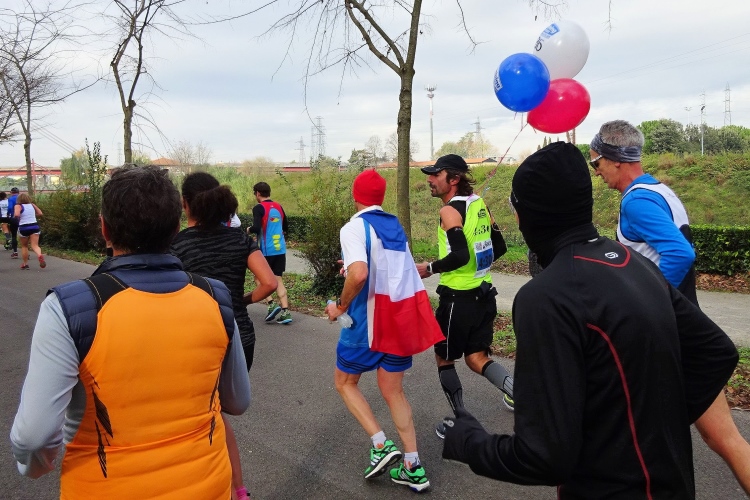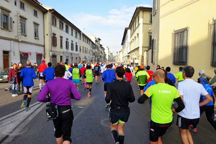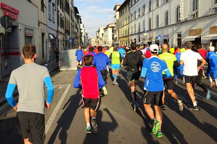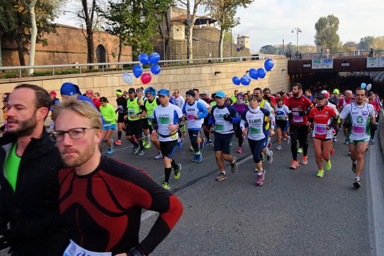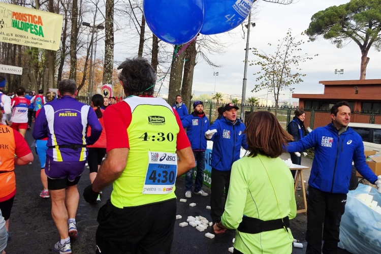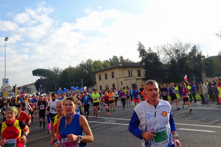 Nach 7,5 Kilometern befindet sich auf der Laufstrecke die erste Schwammstation von insgesamt sieben. Ich kann gerne darauf verzichten, denn mir ist wegen der drei Lagen zwar am Körper warm, doch den Kopf kühlen muss ich um 10 Uhr morgens noch nicht. Stattdessen stülpe ich den linken Ärmel hoch, der die GPS-Uhr verdeckt. Mit etwas über 50 Minuten bin ich inmitten der 4:30er-Tempomacher neben mir bisher unterwegs, das passt. Als wir auf ein Pärchen, sie in schwarz, er in den Farben der Trikolore auflaufen, spricht ein Pacer den Patrioten an und verweist auf seine drei Luftballons ebenfalls in den Farben der französischen Fahne. Es gibt viele, die durch ihr Outfit beim 32. Firenze-Marathon sozusagen für Frankreich laufen.