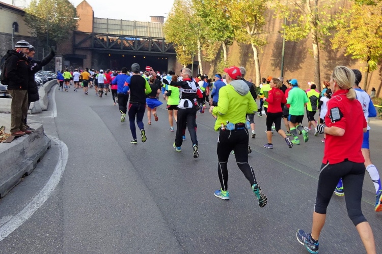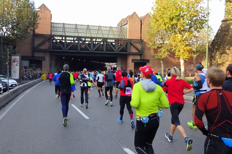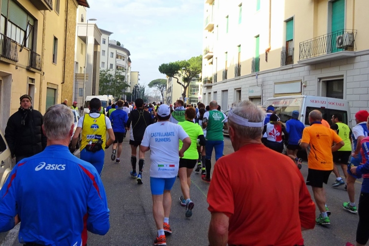 Ein paar Minuten dauert es nach der Elitegruppe, bis auch die Blöcke zum Startbogen kommen. Diesmal drücke ich die GPS-Uhr knapp vor der Zeitnahme-Matte, nicht wie in Istanbul 200 Meter davor – am Ende verpasste ich sub 5 um 18 Sekunden, weil mir die Übersicht fehlte. Zunächst laufen wir die gesperrte SS67 entlang. Der mir aus den vergangenen Jahren vertraute Marathonkurs hat hier ein leichtes Abwärtsgefälle, was zum Tempobolzen verführt. Das Feld ist dicht, eine Hälfte der Straße fast zu schmal. Von hinten drängen, bugsieren und schieben die violetten „langsameren“ Läuferinnen (auch Frauen können rempeln) und Läufer. Ich passe auf meine Digicam auf, ohne Handschlaufe wäre sie schon längst zertrampelt worden. Aber diese Anfangsverrücktheit habe ich auch schon in Berlin, Paris und Wien erlebt – nicht jedoch in NYC, weil fast jeder die lange Verrazano-Brücke am Beginn des Marathons auskostet und sich Zeit lässt.