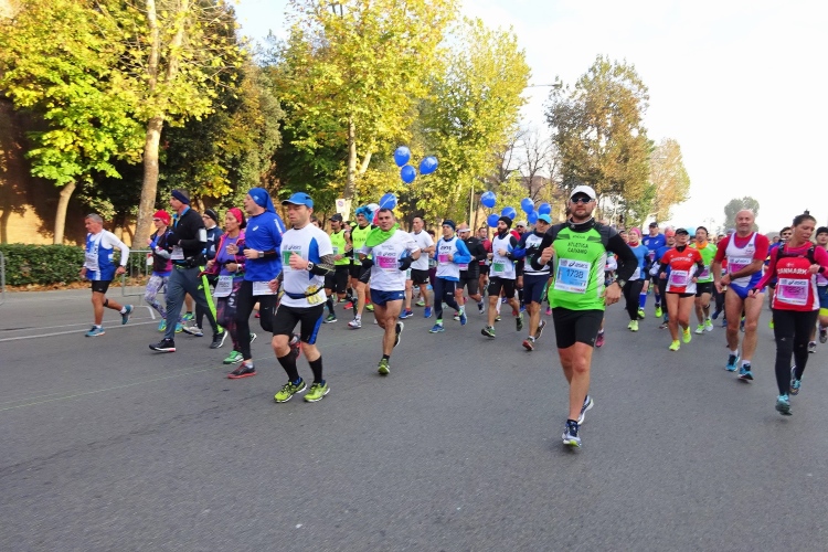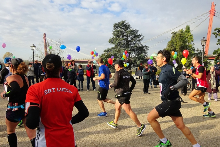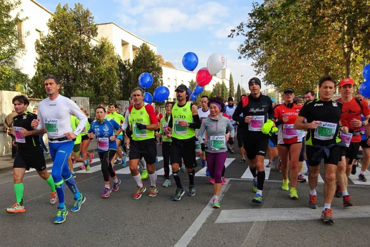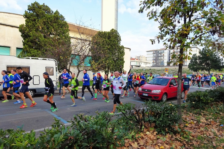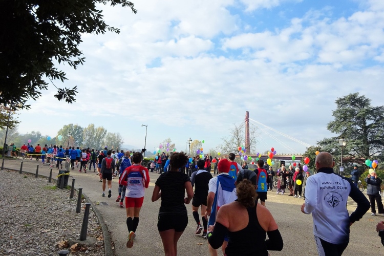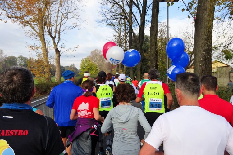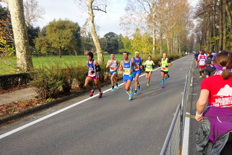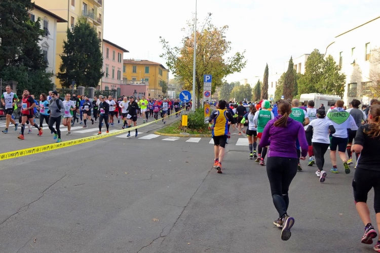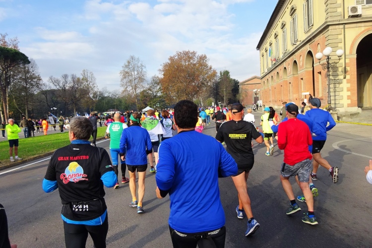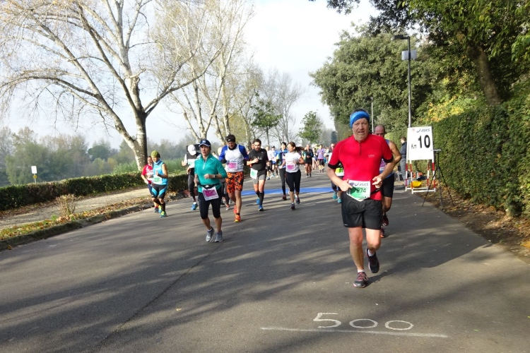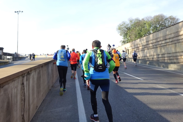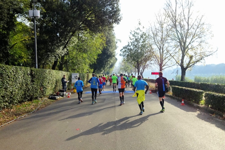 Auf der anderen Straßenseite laufen gerade die vor uns liegenden den Cascine-Park wieder nach Westen zurück. Wer hier ans Abschneiden denkt, unterschätzt die Logik der Zeitnehmer: Sowohl bei der Wende am Arno (zwischen Kilometer 8 und 9), als auch bei einer weiteren Schleife befinden sich Matten, über die man laufen sollte, um eine mögliche Disqualifikation zu vermeiden.